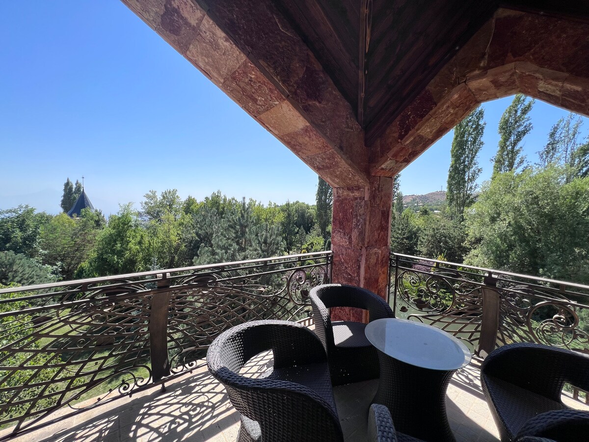 A nossa casa de campo em Byurakan é um refúgio acolhedor nas montanhas arménias com uma vista deslumbrante do Monte Ararat. Aqui desfrutará de ar fresco da montanha, paz e total privacidade. À noite, pode relaxar no jacuzzi privado e admirar o céu estrelado. Perfeita para uma escapadela romântica ou umas férias em família.