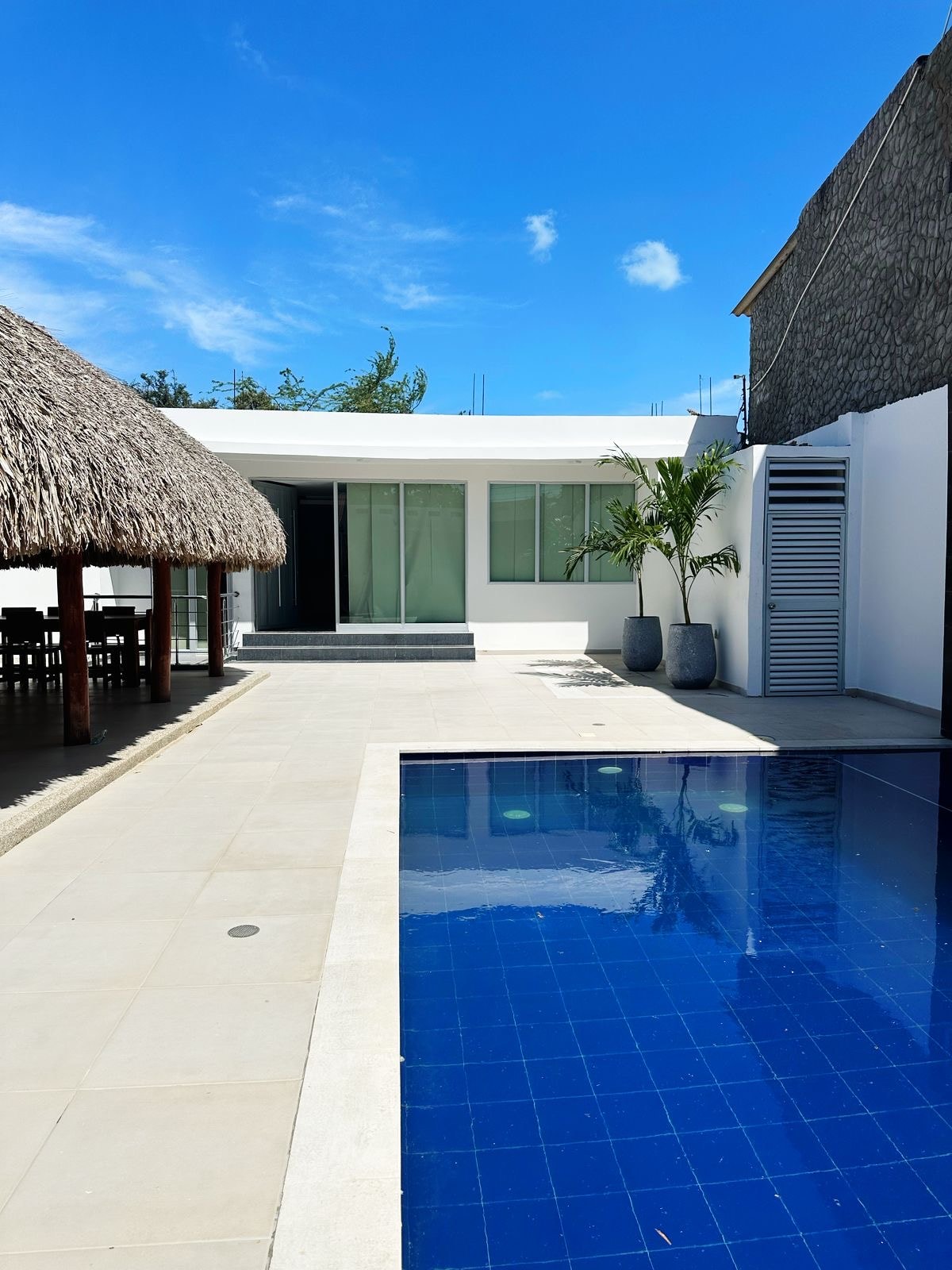 Beautiful private house located just 100 meters from the beach surrounded by nature. The large thatched roof with its own lookout on the second floor provide a wonderful place to see the Sierra Nevada de Santa Marta and birdwatching. The small but refreshing pool is the prefect place to have some afternoon drinks. 4 private bedrooms, distinguished by its colorful doors provide all the privacy needed from the social area. Carefully thought lighting make this house a magical place at night.