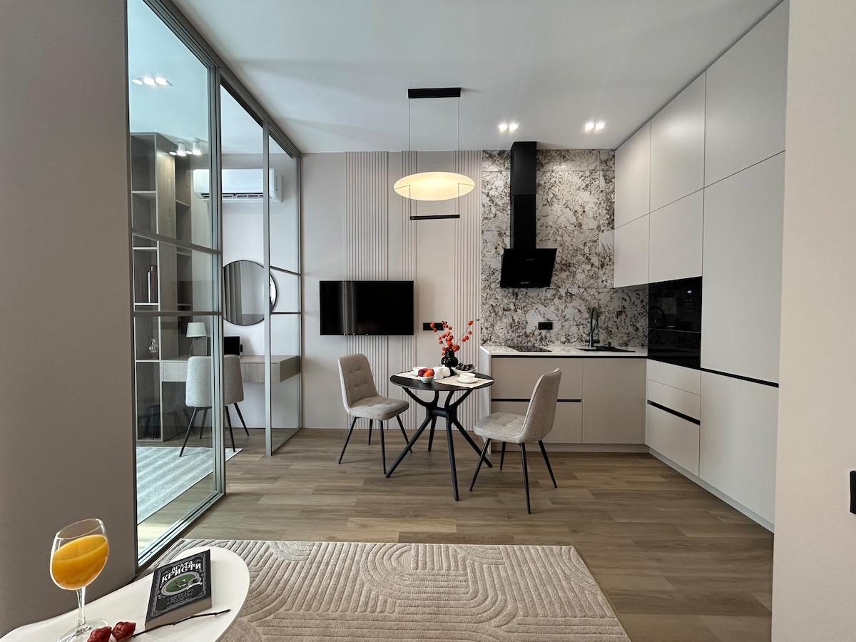 Насладитесь отдыхом в стильных апартаментах Charm, с дизайнерским ремонтом и атмосферой настоящего уюта. Сочетание элегантности, минимализма, современных технологий и спокойной роскоши. Вас ждет: - оборудованная мини-кухня - Зона отдыха с мягким диваном и приятным освещением - Спальная зона отделена стеклянной перегородкой, максимум уюта и уединения - Эффектные световые решения создают атмосферу тепла и спокойствия. Квартира расположена в новом жилом комплексе в самом сердце Алматы