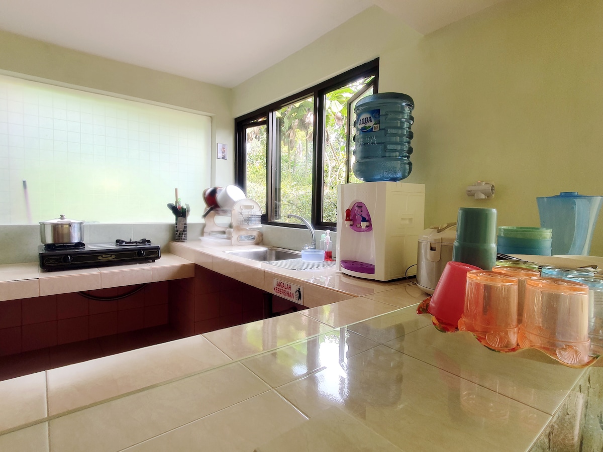 Espere ar fresco entre 16 e 27 graus. Dezembro a fevereiro pode ser muito frio. Ficará surpreendido com o grande terraço virado para as 2 montanhas em Gunung Gede, Pangrango e Mount Salak nos fundos. Toda a moradia e o jardim serão seus durante a sua estadia, incluindo uma piscina infinita com água doce da nascente. Um caseiro fica no pavilhão para o ajudar quando necessário. A comida pode ser encomendada através da aplicação online, uma guerra nas proximidades vende matéria-prima básica disponível.