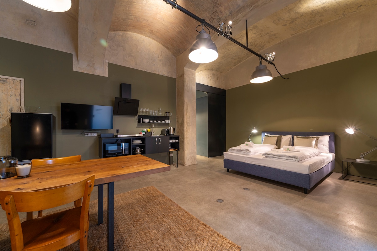 Os quartos de 25 metros quadrados recentemente renovados consistem num quarto com uma cama de 180x200 cm, um terraço de 16 metros quadrados e uma casa de banho privativa. No piso superior do edifício, os quartos são caracterizados por uma vista encantadora da cidade. Os quartos incluem um mini-frigorífico e uma secretária perfeita para trabalhar remotamente. O ar condicionado proporciona aos hóspedes o máximo conforto, independentemente do clima. Cada quarto pode acomodar até duas pessoas.