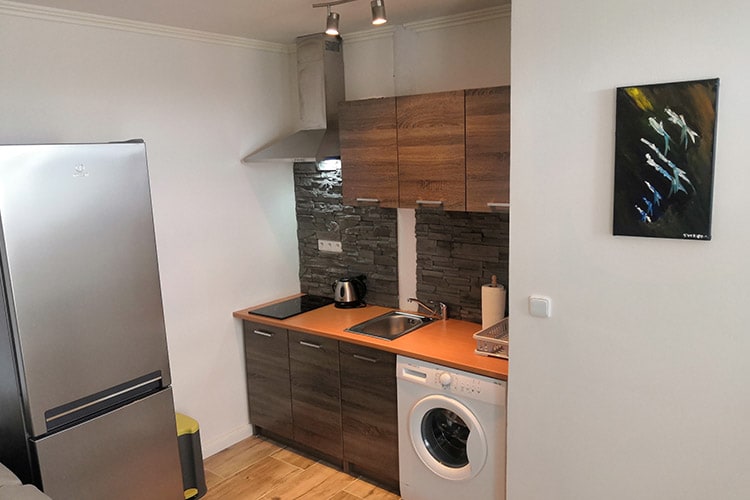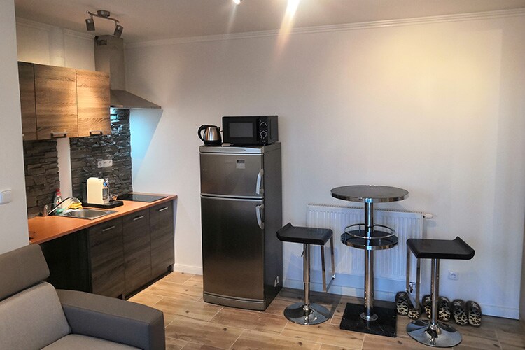 Apartamento acolhedor com equipamento completo. Kitchenette, máquina de lavar roupa, casa de banho, TV e cama de casal. Solução ideal para um casal ou indivíduo. Possibilidade de travar as rodas sob o teto.