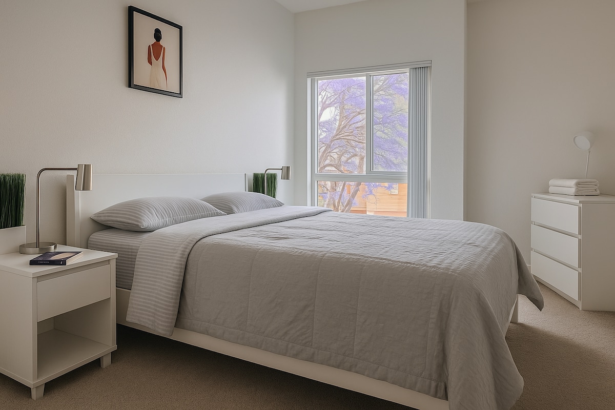 Espaçoso quarto com cama king em West Hollywood. - Mesa de trabalho. - Varanda privada com vista para Hollywood Hills. **Duas TVs de 55 polegadas, uma no quarto e outra na sala de estar.** - Estacionamento reservado fechado gratuito para 2 carros. - Máquina de lavar e secar roupa no interior. (Detergente incluído). - Cama king size de espuma de memória e sofá elegante! - Chuveiro espaçoso com itens essenciais. - Cozinha totalmente equipada e nova com máquina de lavar louça. LIMPEZA PROFISSIONAL E HIGIENIZAÇÃO ANTES DE CADA CHECK-IN!