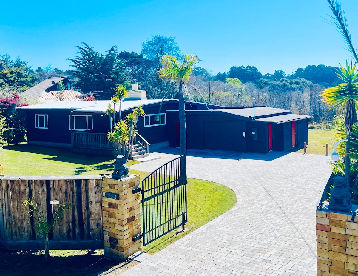 Arquitetonicamente requintado! Situado em jardins tranquilos, bonitos e pacíficos com grande lago. Lindos móveis feitos sob medida, aparelhagem de som, chuveiro de bloco de vidro tipo spa. Roupões de spa disponíveis. Calor radiante. Um quarto no loft, um no andar de baixo. Curta caminhada sobre dunas até a deserta Ten Mile Beach. Como o acesso é limitado, a praia está praticamente vazia - um segredo costeiro. Eu moro na propriedade com meu golden retriever e gato (não permitido na casa de campo), mas após o check-in eu quero minha privacidade tanto quanto você