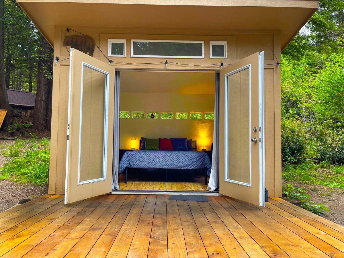 Cabana de hóspedes acolhedora com vista para sequoias gigantes na nossa antiga propriedade. Paragem perfeita numa viagem de carro, a apenas 1,5 milhas da HWY 1 e aventuras intermináveis na costa. 🛏️ Interior: cama queen size com lençóis de flanela de algodão aconchegantes, edredão e almofadas macias, sofá de dois lugares, conjunto de café, frigorífico pequeno, livros em abundância. ✨Sem Wi-Fi ✨ 🌲 Ao ar livre: chuveiro quente com vista para as sequoias e céu aberto, lavatório, casa de banho de compostagem com estufa a cerca de 30 degraus da cabana.