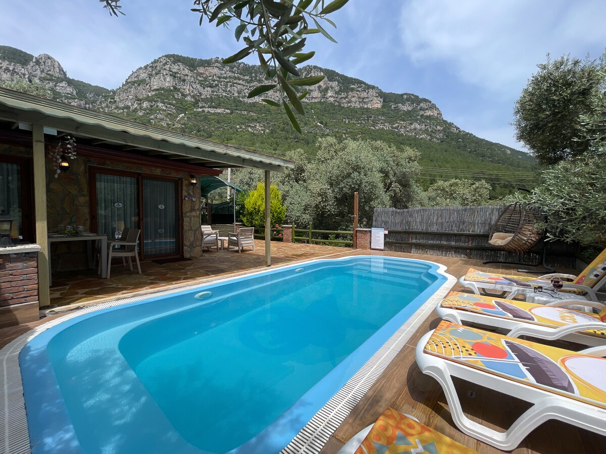 Bangalô único em um calmo jardim de laranja e limão ORGÂNICO e calmante. Relaxe seu corpo em uma jacuzzi aquecida ao ar livre. À tarde, caminha no ar fresco à beira-mar em Akyaka 10 minutos de carro da casa, um passeio na floresta de pinheiros logo atrás, passeios a cavalo no estábulo. À noite, você pode assistir à sua série favorita da Netflix. Grossery e loja de bebidas alcoólicas a 10 min a pé.