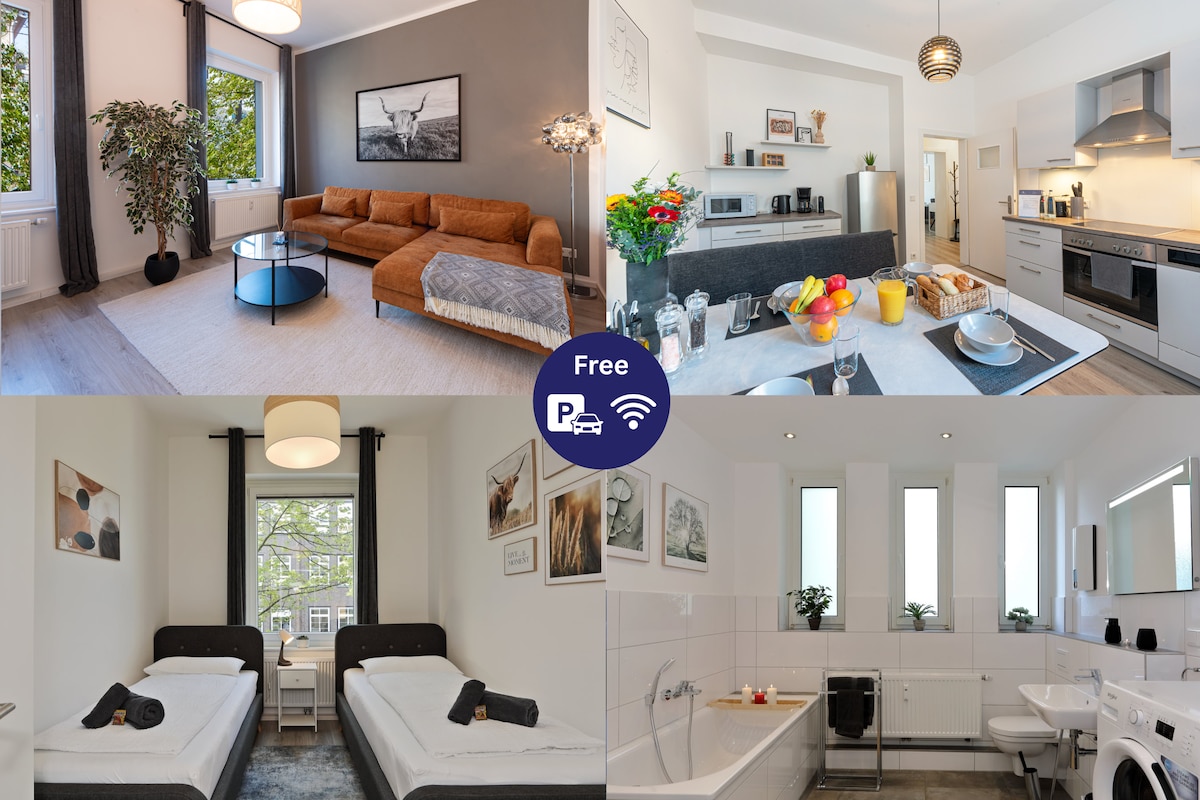 Willkommen in deiner stilvollen, gemütlichen Wohnung im Herzen von Rüttenscheid! Top Lage - nur eine Minute zu Fuß zur beliebten "Rü" mit ihren vielen Cafés, Bars und Restaurants. Auch die Messe Essen, das Klinikum und der Hauptbahnhof sind schnell erreicht (ca. 1,5km entfernt). Die Wohnung ist voll ausgestattet: ein bequemes Kingsize Bett, einen eigenen Netflix-Account, ein großzügiges Wohnzimmer mit Essbereich und einen Balkon mit Blick in den Garten. Perfekt zum Entspannen!