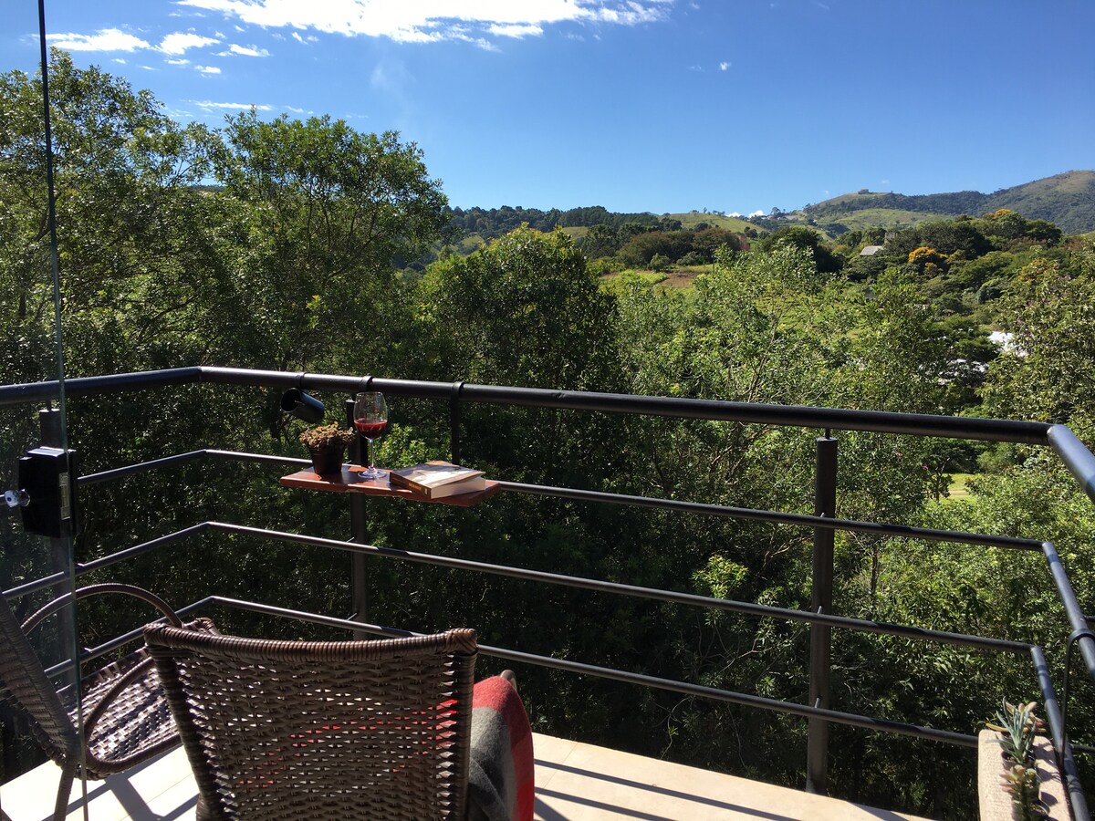 Aproveite a beleza deste lugar elegante e sofisticado. Com arquitetura moderna, oferecemos novo conceito de hospedagem: lodges independentes e equipados aliam charme, conforto e tecnologia. Amplas portas de vidro dão acesso a varanda com vista panorâmica. No banheiro, desfrute da ducha forte, quente, revigorante. O Terraço, para convívio e culinária, ofurô esculpido num tronco gigante e área para fogueira complementam o Projeto Uma experiência inovadora, onde prevalece o silêncio e a natureza !