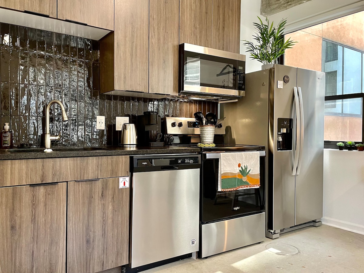 Bem-vindo ao High Rise Haven, um apartamento industrial aberto e arejado aninhado no coração da cidade. Este loft moderno apresenta tetos e pisos de concreto expostos com paredes de janelas e vista para a cidade. O quarto dispõe de uma cama king size com um colchão muito confortável e TV de 50 polegadas. Desfrute também do terraço do oásis urbano com vista para o horizonte ao redor. Com várias outras comodidades para desfrutar, venha relaxar neste loft industrial exclusivo, perfeito para uma escapada de casal ou retiro urbano solo.