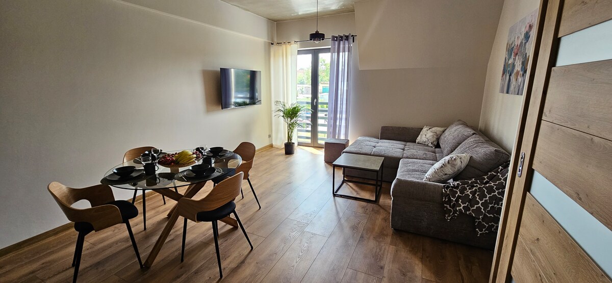 Um apartamento ensolarado numa rua tranquila na Universidade com estacionamento gratuito. Perto de dois lagos, uma floresta e paragens de autocarro que nos levarão em 15 minutos à cidade velha de Olsztyn, ao Lago Ukiel e diretamente à estação. O apartamento no primeiro andar tem uma cozinha totalmente equipada e uma casa de banho. É composto por dois quartos acolhedores. Acomoda 4 pessoas. A 15 minutos a pé do Lago Kortowskie com uma praia vigiada, a 5 minutos de um lago selvagem. Perto de lojas e restaurantes.