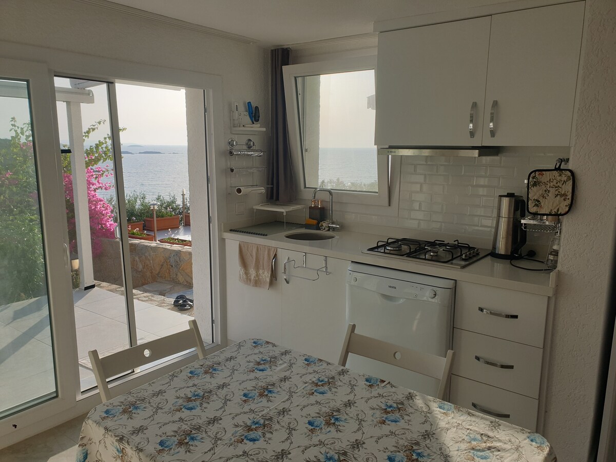 Uma casa bonita e muito perto do mar... A casa fica em Zergülkent Sitesi, Bogazici, Milas. Pode caminhar até 2 belas praias diferentes em 5 minutos. Fica a cerca de 35 minutos de carro do Bodrum Center, a 30 minutos de Milas e a 20 minutos do Aeroporto de Bodrum. Temos mercearias em 5-10 minutos de carro. A nossa casa tem 3 andares com entradas diferentes. Estamos a alugar 2 dos apartamentos. Este é o primeiro andar. Estamos principalmente presentes no piso médio e tentamos o nosso melhor para o seu conforto e bem-estar. Até logo:)