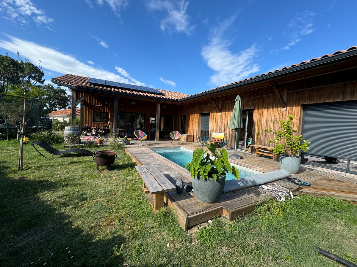Casa de madeira de 150 m2 com piscina aquecida. (Não disponível de 1/11 a 1/4). 8 camas. Localizado entre Mimizan bourg e a praia, (ciclovia a 150 metros da casa) Grande sala de estar, cozinha equipada, sala de estar. 4 quartos (1 com cama de 180, 2 com cama de 140, 1 com 2 camas de 90) opção de adicionar uma cama de cododo 2 casas de banho, 2 Casa de banho Terraço com comodidades (plancha, churrasqueira, mobiliário ...) Wi-Fi, sem TV Arrendamento por 2 noites no mínimo.