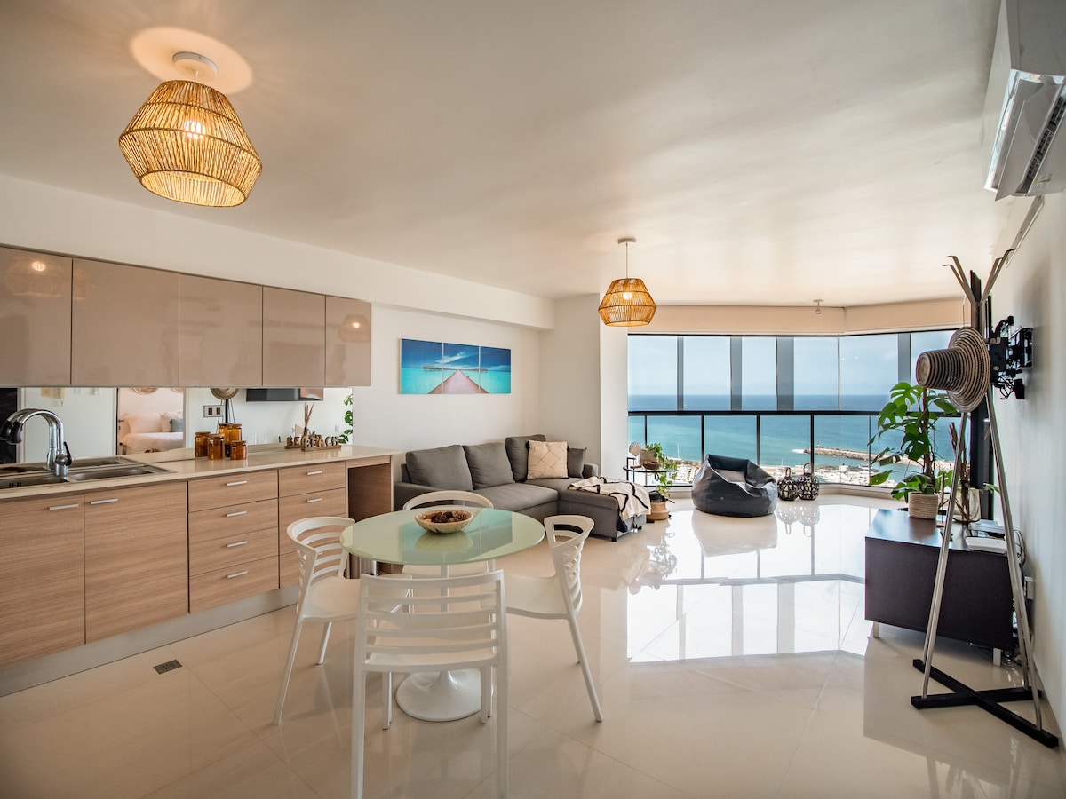 Relaxe nesta escapadela única e tranquila. Vista total para o mar, piscina espetacular, snack-bar, serviço de alimentação, segurança 24 horas, estacionamento, 1 quarto, 1 cama de casal, 1 sofá/cama dentro do mesmo quarto, cozinha, forno, micro-ondas, máquina de café, água quente, tanques de água, 2 TV, mobiliário, Wi-Fi, 2 aparelhos de ar condicionado. Praias e resorts públicos e privados a 6 minutos de distância, "tem de viajar de carro" Cheio de tanques diariamente ao sair do apartamento. Piscina em manutenção às segundas-feiras.