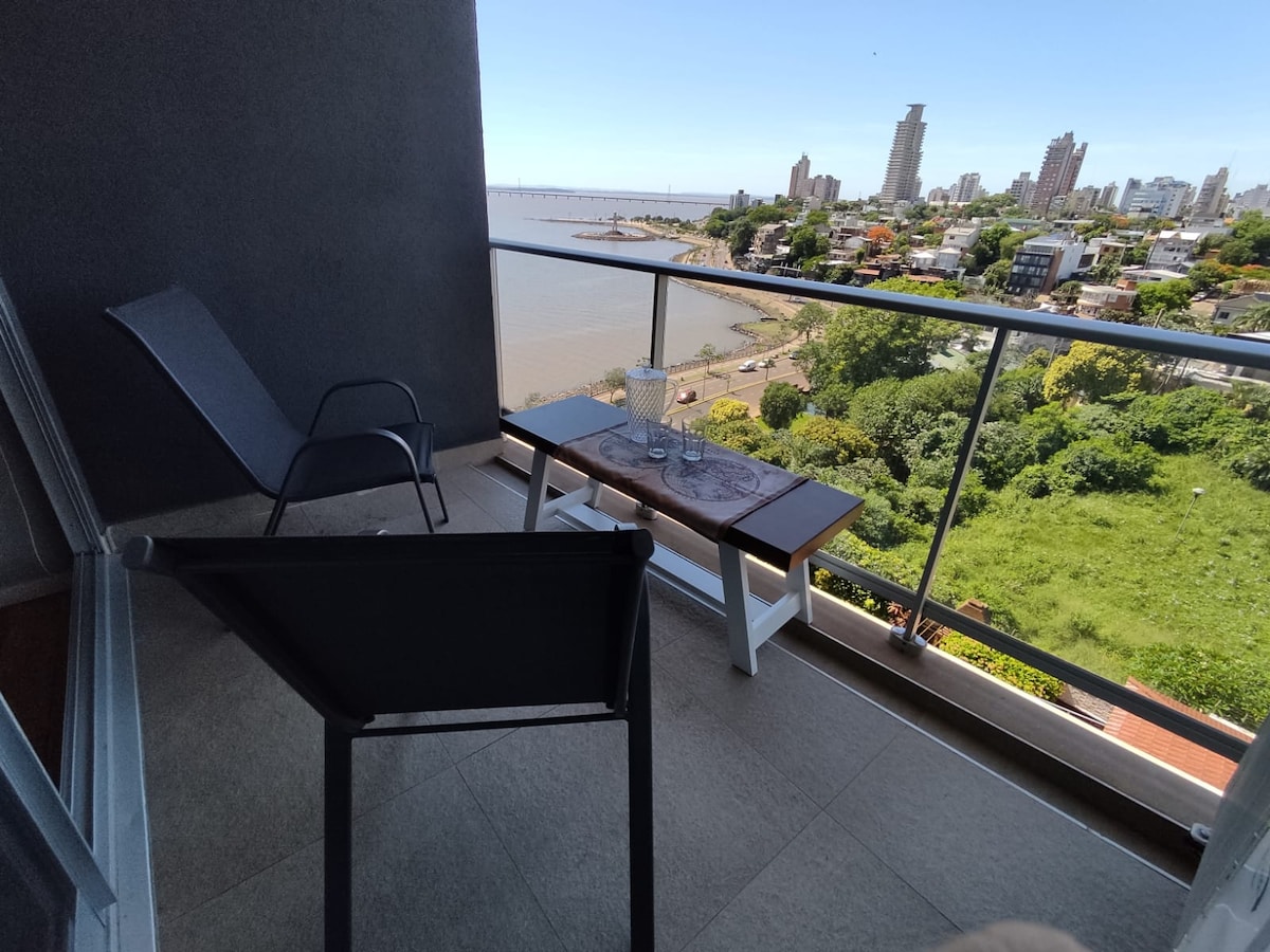 Apartamento espaçoso, muito confortável, com vistas espetaculares para o Rio Paraná e perto do centro. Localizado na costa e a metros de Paso Fronterizo Posadas- Encarnación.