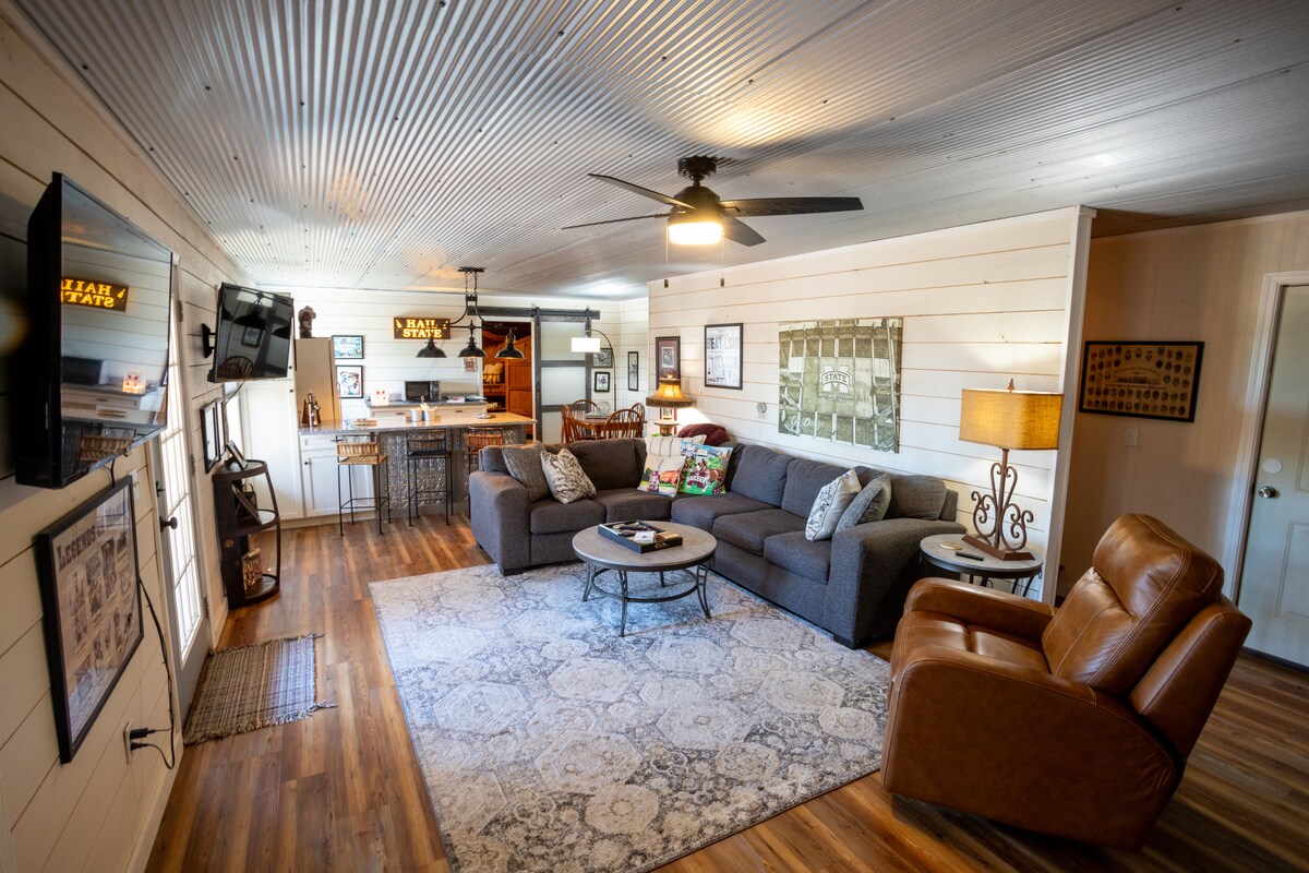 Nossa casa de hóspedes na fazenda está perfeitamente localizada para jogos e visitas ao campus. Situado em 20 acres tranquilos perto do campus. Casa de hóspedes de dois quartos dentro do nosso belo celeiro vermelho com uma cozinha acoplada (geladeira, cafeteira, pia e micro-ondas), sala de estar e banheiro. A casa de hóspedes tem 700 pés quadrados de espaço privativo totalmente central com ar condicionado. A entrada da frente tem uma varanda coberta e entrada privativa. Este celeiro é separado da nossa casa de fazenda, a cerca de 150 pés de distância. Animais de estimação não são permitidos.