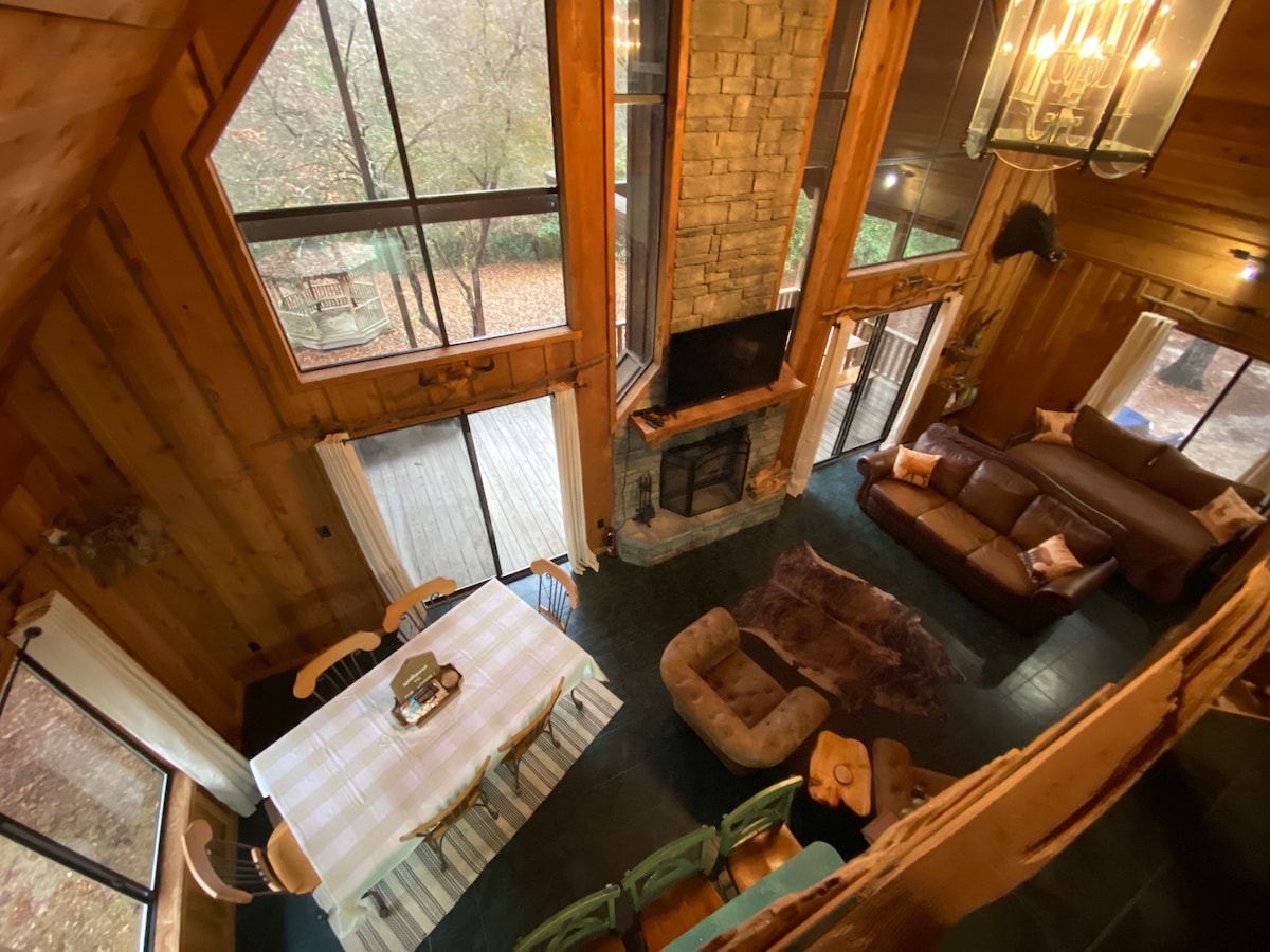 Esta bela, acolhedora, isolada, 2 camas/2 banheiros lhe dá a sensação de estar nas montanhas! Possui uma cozinha totalmente equipada, piscina de imersão, banheira de hidromassagem, 2 bares ao ar livre, área de cozinha com churrasqueira a carvão. Está cercado por mais de 2.000 pés quadrados de deck ao ar livre!! Esta propriedade também tem uma suíte de hóspedes com 1 quarto, 1 banheiro, cozinha e área de estar que pode ser adicionada por um adicional de US$ 100/noite. A propriedade está localizada atrás de um portão privado. Venha relaxar e aproveitar o “PARAÍSO” hoje!