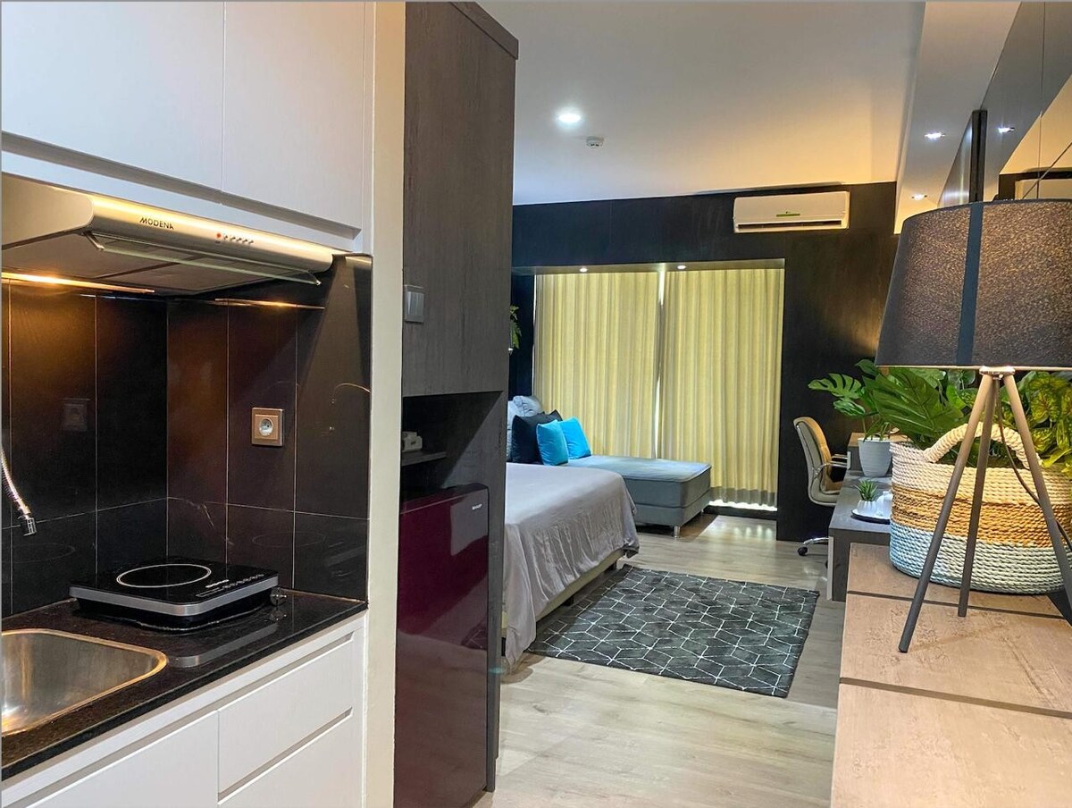 Projetado pela sua, este apartamento estúdio fará com que se sinta em casa na cidade de Yogyakarta. Este quarto tem tudo o que precisa, uma cama grande com um sofá grande, Wi-Fi de alta velocidade e uma máquina de lavar roupa. O edifício do apartamento tem uma instalação completa; uma piscina, piscina infantil, parque infantil, parque infantil, ginásio, estacionamento gratuito, mini Mart, salão de beleza, restaurante, espaço de trabalho, café, serviço de lavandaria. A localização é estratégica perto de muitos lugares para ir em Yogyakarta!