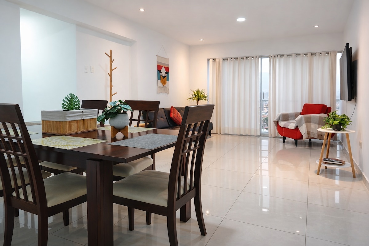 Desfrute deste lugar tranquilo e central, com todas as comodidades necessárias. Ambientes com luz natural, TV com plataformas digitais, Wi-Fi, sala de estar, sala de jantar, cozinha equipada com vários artefactos, chuveiro com água quente, terraço, área de grelhador e ginásio. Terá acesso rápido aos principais centros comerciais e ao centro da cidade, bem como a uma grande variedade de restaurantes, mercados e parques.
