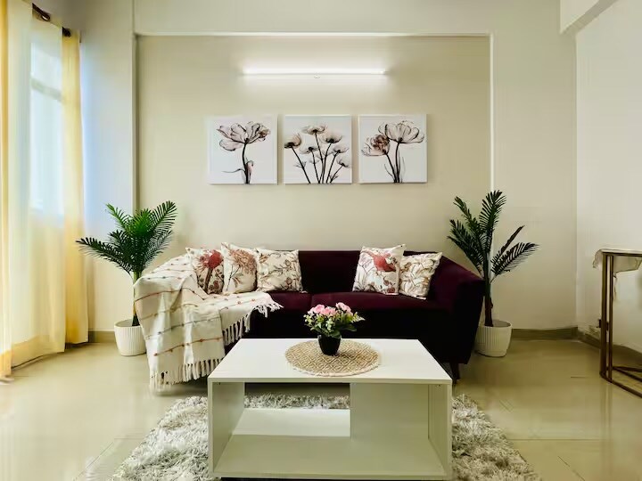 Our newly constructed 2 BHK apartment blends modern comfort with natural charm. The space features 2 serene bedroom with a queen-size beds, a spacious living room, a well equipped kitchen, 2 bathrooms: one attached to the master bedroom and another accessible from the living room and second bedroom and L- shaped balcony offering great view of the city. The property is located near a premium mall in Noida! This well-situated location offers you the convenience of shops, cafes, and entertainment.
