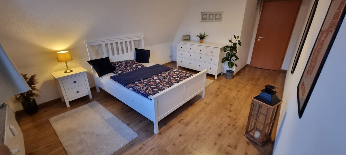 Desfrute de uma experiência elegante no nosso apartamento no sótão inundado de luz em Eschenstraße! Com cerca de 90 metros quadrados, um retiro acolhedor espera por si, ideal para casais, famílias ou viajantes de negócios. As grandes janelas criam um ambiente amigável e oferecem uma vista magnífica sobre a cidade e o porto. Pode esperar uma cozinha totalmente equipada, uma sala de estar confortável, um quarto acolhedor e uma casa de banho elegante.