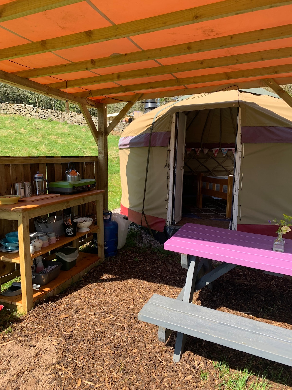 Uma iurta totalmente mobiliada. Situado no deslumbrante Vale de Wye, em Monmouthshire. O deslumbrante ambiente natural permite que você desacelere, relaxe e aprecie as coisas simples da vida, mas com todas as comodidades modernas da vida moderna. Até seis hóspedes podem dormir nesta yurt com uma cama super king-size para maior luxo e há futons individuais que podem ser usados como camas confortáveis. Este yurt tem seu próprio banheiro externo privativo e fica perto da cozinha compartilhada. Este é um lugar ensolarado.