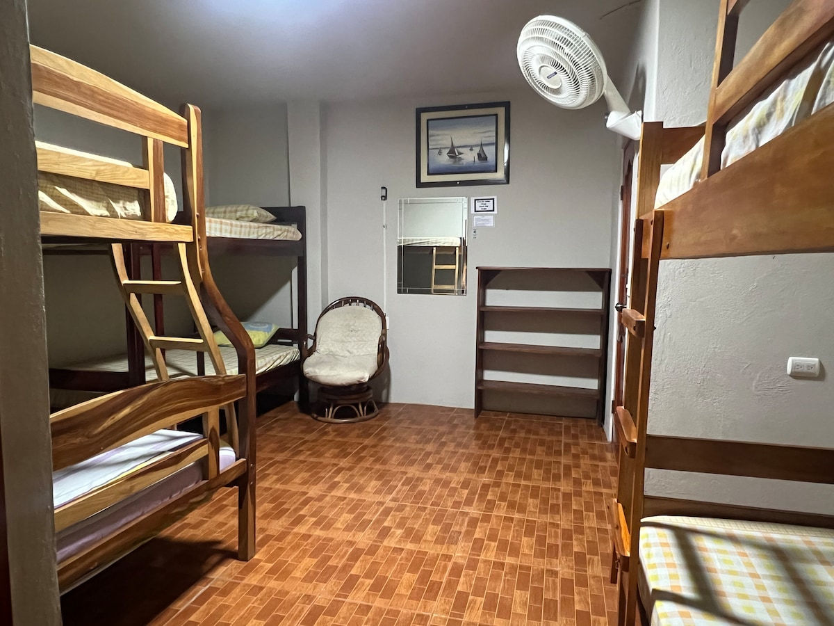 Quarto no rés-do-chão com uma cama de casal e dois beliches de 1,5 camas, ideal para grupos ou famílias até 6 pessoas. Tem ar condicionado, casa de banho privativa funcional, Smart TV com Netflix, armário e cabide. Confortável e bem ventilado. Acesso gratuito à piscina, cozinha, grelhador, jardins, redes e muito mais. Apenas a 7 minutos da praia e do centro de Montañita, mas longe do barulho. Tranquilidade e espaço para partilhar.