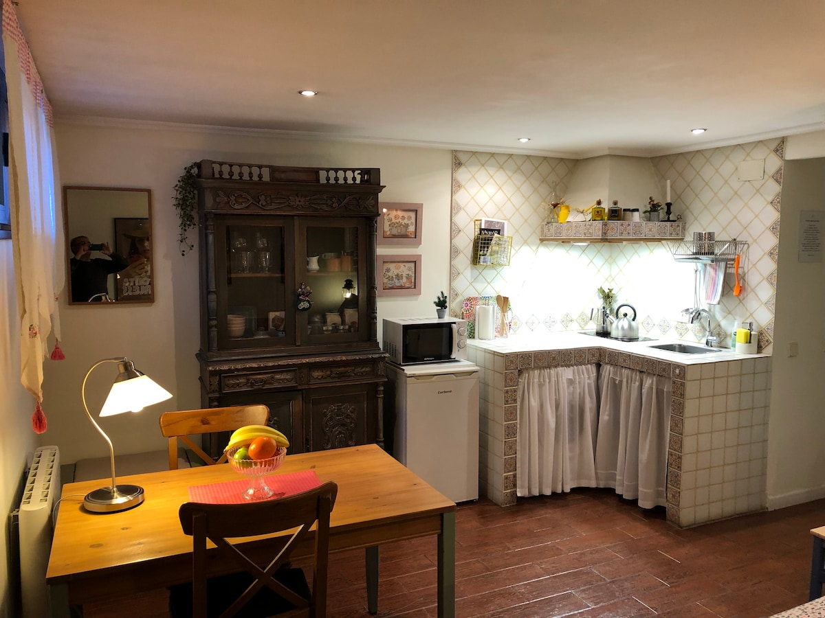 Decorei este estúdio com amor e cuidado, como para meus filhos. Com todos os detalhes. Você vai apreciar nas fotos. Cama (140X200), cozinha americana, louça completa, talheres, eletrodomésticos, fogão vitrocerâmico, geladeira, micro-ondas, torradeira, espremedor, TV, máquina de lavar roupa, banheiro com chuveiro. Acesso direto e independente à casa. Tranquilo e luminoso!