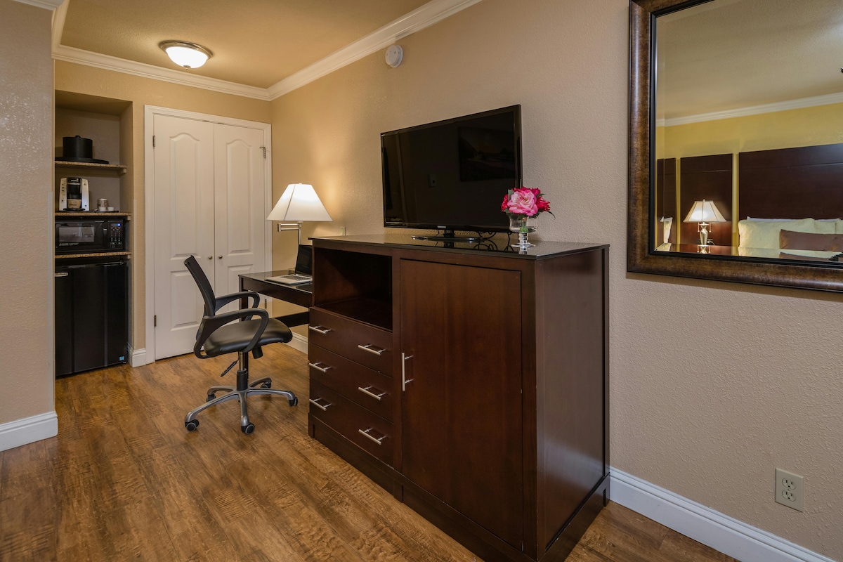 O nosso Standard King é um quarto espaçoso com ar condicionado, com uma cama king size da Califórnia, tornando-o um quarto perfeito para casais. O quarto Standard King possui uma bela casa de banho envolvente de granito com uma casa de banho completa e secador de cabelo. Cada quarto tem uma televisão HD de 42 polegadas, chamadas locais gratuitas, cofre pessoal embutido, ferro e tábua de engomar, máquina de café Keurig e micro-ondas/frigorífico.