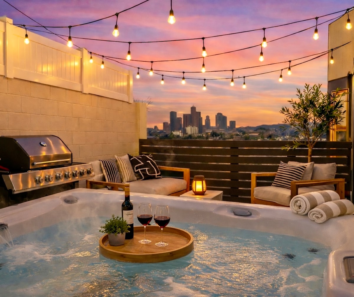 Vistas para o horizonte de DTLA + banheira de hidromassagem • Escapadela elegante em LA!