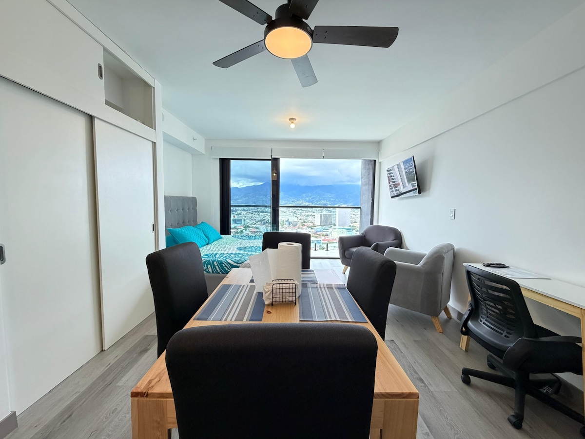 Disfruta de la tranquilidad de este smart loft, elegante y céntrico con vista a la ciudad! Ideal para relajarse. Cuenta con todos los servicios necesarios para hacer de tu estadía la más agradable con la más alta calidad. Su ubicación es favorable ya que se encuentra cerca de restaurantes, centros comerciales y supermercados. Está a solo 15 min del casco central de San José. Cuenta con una gran cantidad de amenidades como piscina temperada, cine, sala de estudio, gimnasio y área de coworking.
