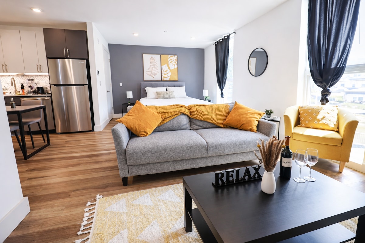 Desfrute de uma estadia fresca e moderna no coração de King of Prussia ✨ Este apartamento de 1 quarto, recentemente renovado, está totalmente equipado com mobiliário totalmente novo, incluindo um colchão, um sofá e muito mais, proporcionando-lhe um espaço limpo e confortável onde é fantástico voltar a casa. O apartamento dispõe de uma cozinha totalmente equipada com fritadeira a ar, máquina de café expresso, frigorífico com congelador e utensílios de cozinha, além de uma acolhedora área de estar com uma smart TV, perfeita para relaxar após o dia.