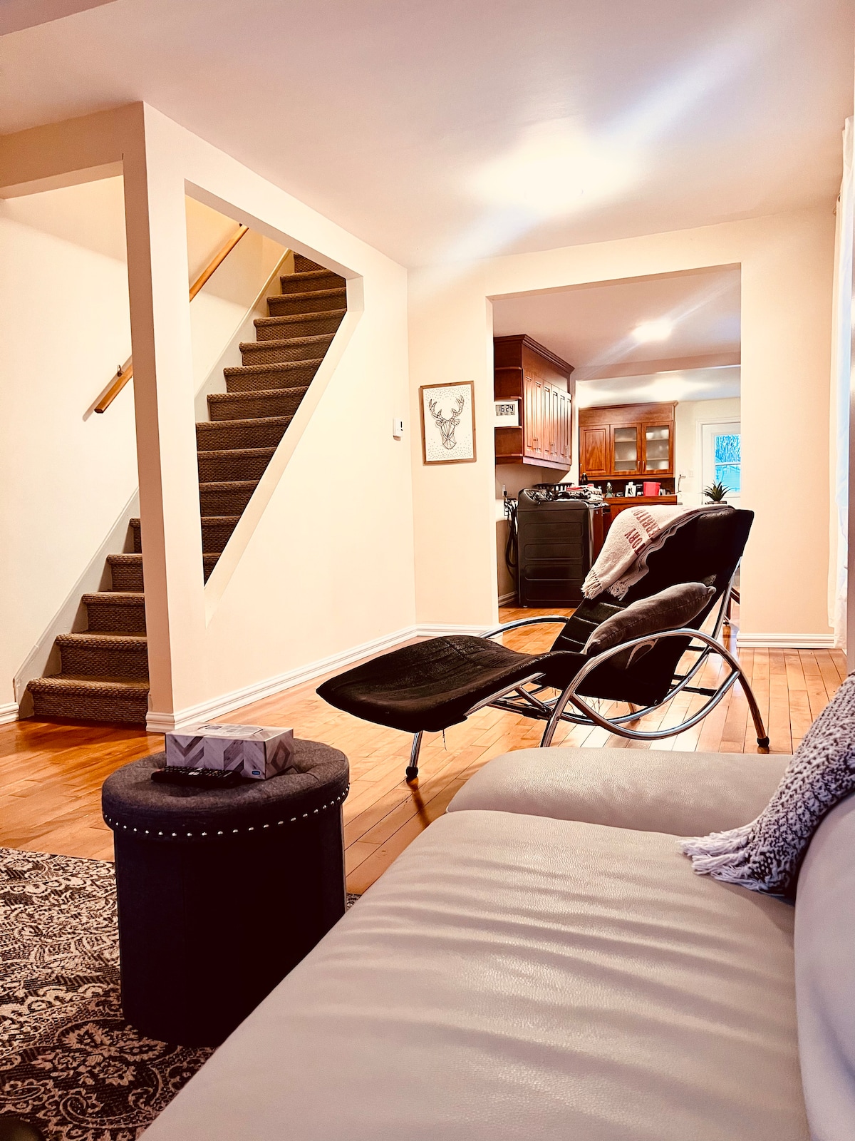 Chalé familiar acolhedor em Laval Desfrute de uma estadia tranquila nesta espaçosa casa de 3 quartos — perfeita para famílias, casais ou trabalhadores. Localizado num bairro tranquilo perto de um parque e do rio, a uma curta distância de carro de Montreal. Quartos • Quarto 1: cama queen (110" × 157") • Quarto 2: cama de solteiro (100" × 107") • Quarto do sótão: cama queen + cama de solteiro (teto 67") Cozinha Equipado com torradeira, micro-ondas, forno, frigorífico, congelador, máquina de café e Nespresso. Duas FireTVs para streaming, além de jogos e brinquedos para crianças.