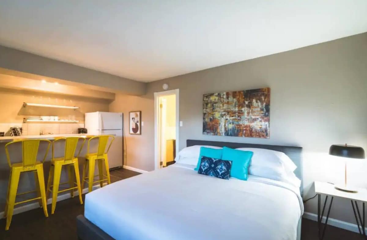 Linda suíte com entrada privativa e grande quintal. Localizado no coração da Rice Military. Animais de estimação e família. Decoração contemporânea de bom gosto. Suíte inclui: cama king size, estação de café/chá, mini geladeira, micro-ondas, grande área de trabalho, lindo pátio privado instalado no quintal, banheiro grande, Wi-Fi de alta velocidade. Excelente para solteiros, casais, viagens de trabalho, família ! Excelente localização - Fácil acesso para o Heights, centro da cidade, centro médico e muitas outras áreas! 5 avaliações ⭐️de limpeza!