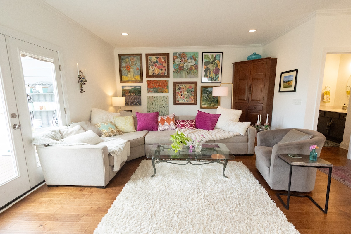 Relaxe nesta unidade de nível superior calma e elegante de 3 quartos/2 banheiros completos. Outro Airbnb está na unidade de porão acabada. O espaço é completamente seu e não há acesso à outra unidade do porão. A única área compartilhada é o deck traseiro. A unidade tem uma cozinha completamente atualizada com aço inoxidável e granito. O quarto principal tem uma cama queen super confortável e um banheiro principal que tem um belo chuveiro. O quarto de hóspedes tem outra cama queen size e a área de escritório tem um futon. Elegância e estilo boho romântico em todos os lugares!