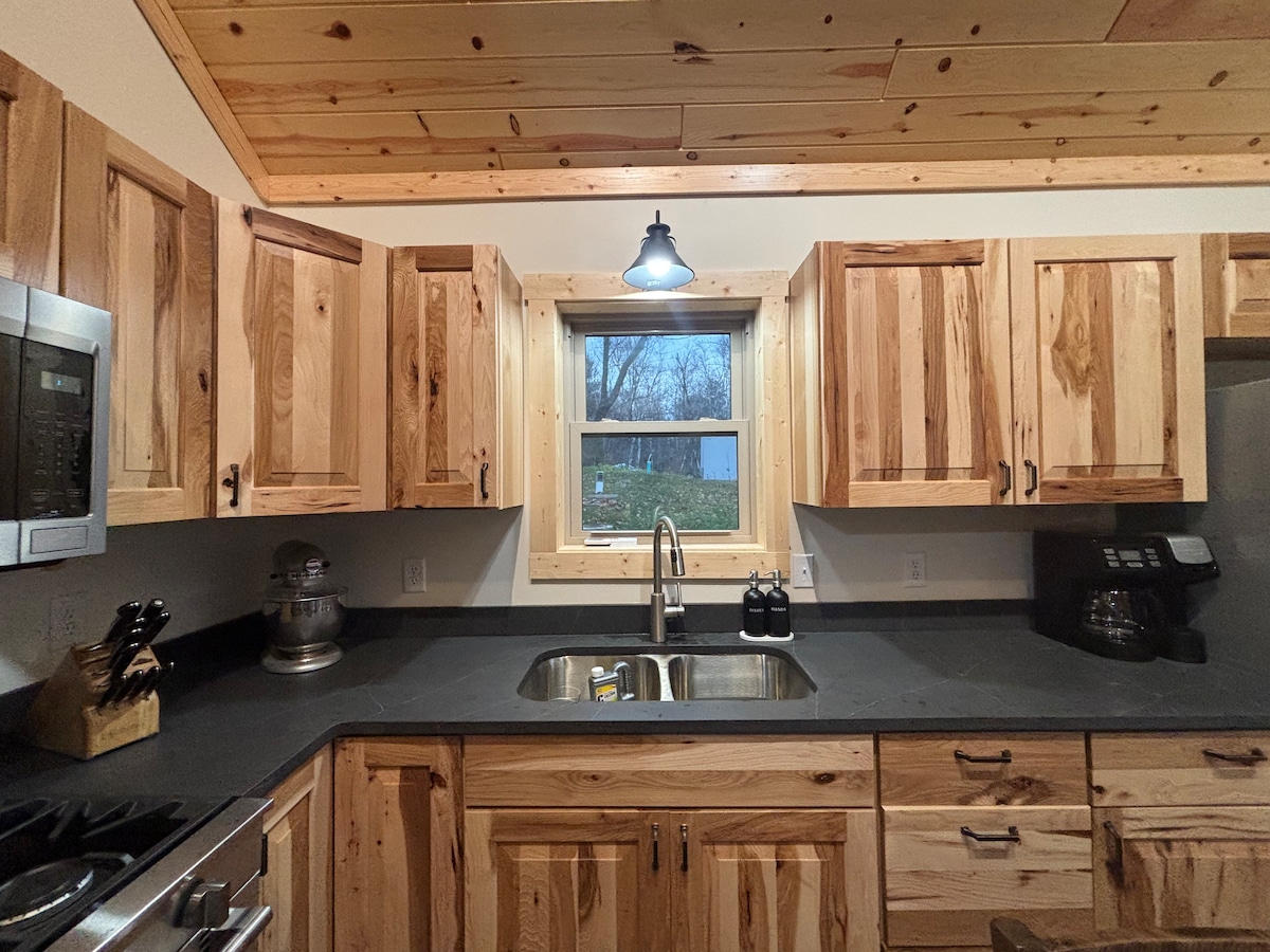Esta cabana moderna está localizada a 390 pés do belo rio Kettle. O rio é bem conhecido por suas ótimas águas, canoagem e caiaque. Há uma lareira a gás, banheira de hidromassagem e Wi-Fi. A banheira de hidromassagem mais nova pode acomodar 6 pessoas. Grande deck expansivo com assentos. Fogueira e uma grande churrasqueira a gás. O chalé é moderno e muito confortável. Os lençóis são da Pottery Barn e os utensílios de cozinha são da Kitchen Aid! Máquinas de lavar e secar. Sete hectares de floresta com alimentadores de veados e pássaros para a vida selvagem. Esta cabana é incrível!!