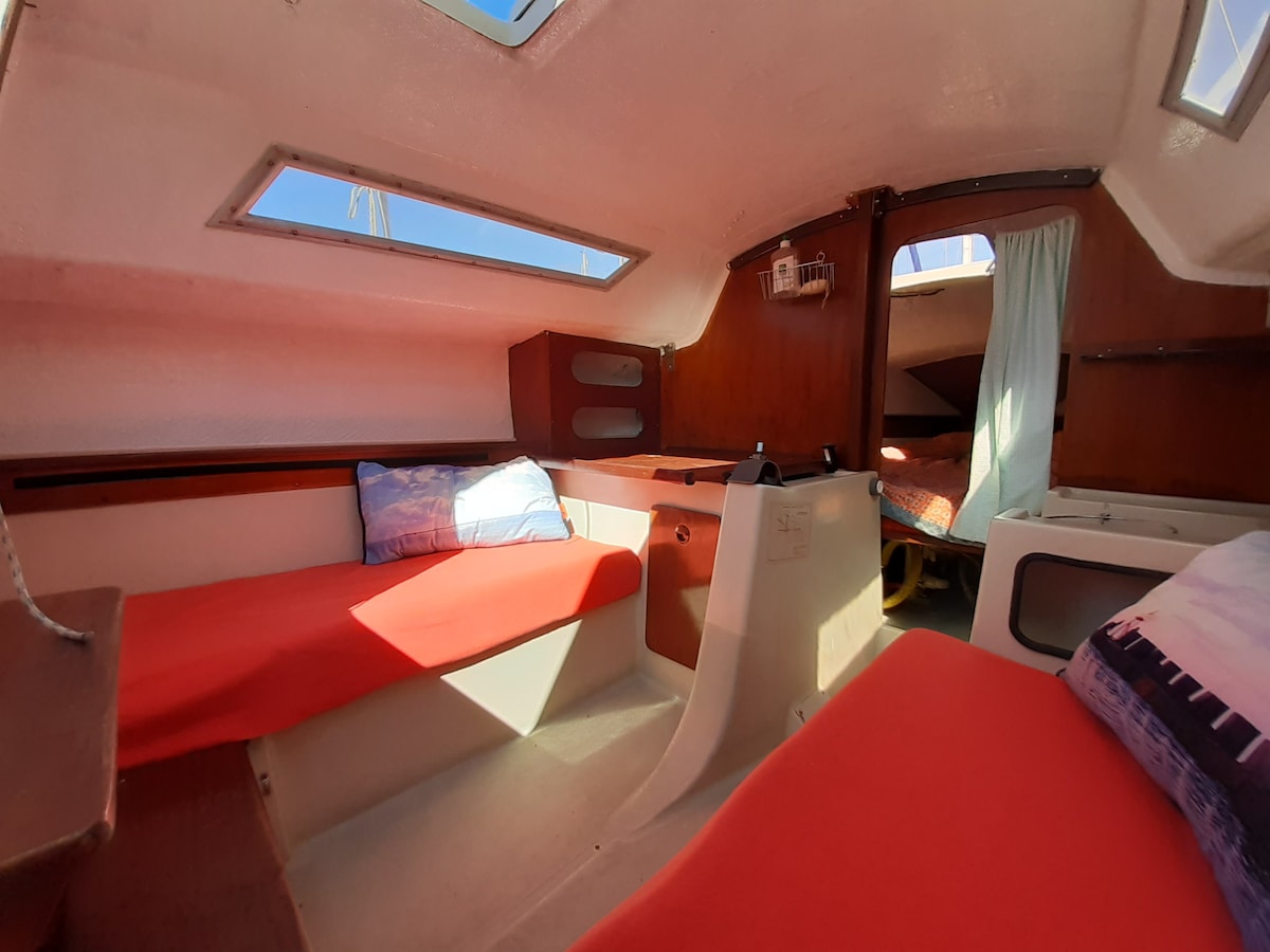 Veleiro de 8m30 com cabine dupla frontal Quarto com 1 sofá-cama de casal e um beliche para criança, mesa com 2 abas, fogão de cozinha com 2 bocas, micro-ondas, geladeira e freezer, louça completa para 4 pessoas Cafeteira elétrica de cápsulas Banheiro pequeno O barco é aquecido, por isso é muito agradável no inverno Estacionado idealmente na parte de trás, virado para o sul Mesa externa removível com guarda-sol
