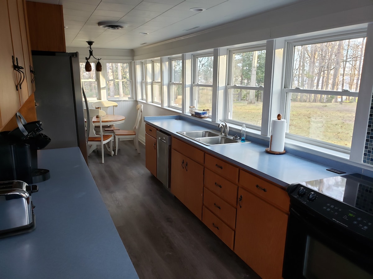 Tranquilo chalé pitoresco dos anos 1940 no rio, área de praia privativa para ter fogueiras, caiaques ou canoa estão disponíveis para uso, quintal grande. Os quartos são pequenos, mas adequados, com um banheiro. Pequeno degrau para entrar na casa, tão bom para as necessidades de deficientes. Todos os acessórios de um lar.