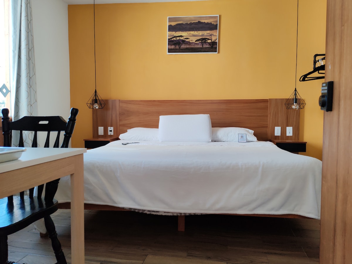 Quarto com terraço no centro de Morelia. Fique no coração de Morelia com uma vista incrível ✨ Tem uma cama king size, televisão inteligente com Roku, terraço, casa de banho privativa, água quente, minibar e forno de micro-ondas. Não temos estacionamento, mas há parques de estacionamento nas proximidades ou podem estacionar no exterior 🚗 Sem animais de estimação, fumar, hóspedes, festas 🚫 Temos um check-in autónomo 🔐 Se estiver a viajar em negócios, também cobramos 💼