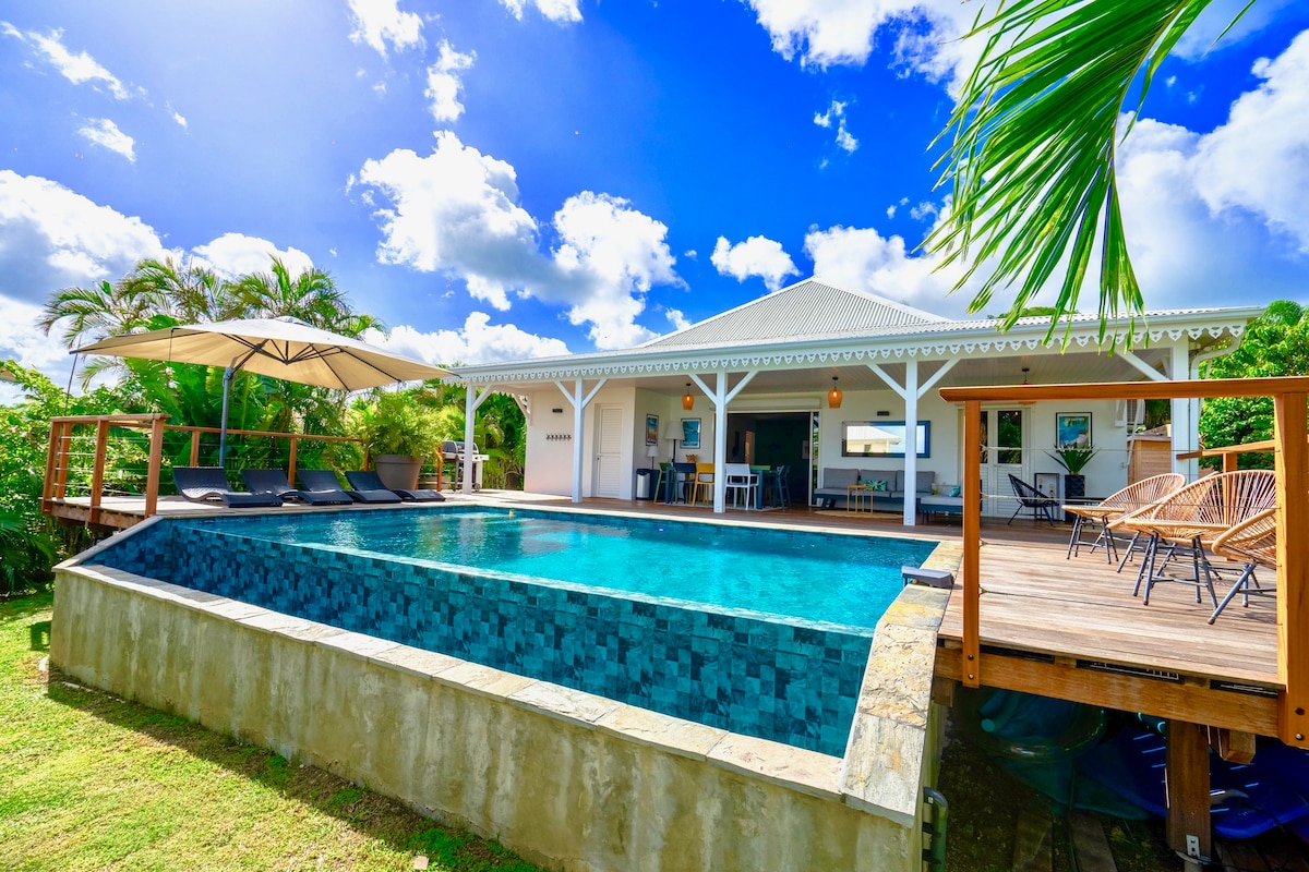 La villa Sunset est un joyaux brut situé idéalement à 200m des plus belles plages de la côte Caraïbes. Idéal pour les séjours en famille ou entre amis, cette villa de haut standing est composée de 3 chambres doubles climatisées et de 3 salles de bain privatives pouvant accueillir jusqu'à 6 voyageurs. Vous pourrez vous détendre sur notre magnifique terrasse couverte et sa piscine au sel chauffée! Classé 4 * par Atout France, garantissant un séjour de qualité supérieure.