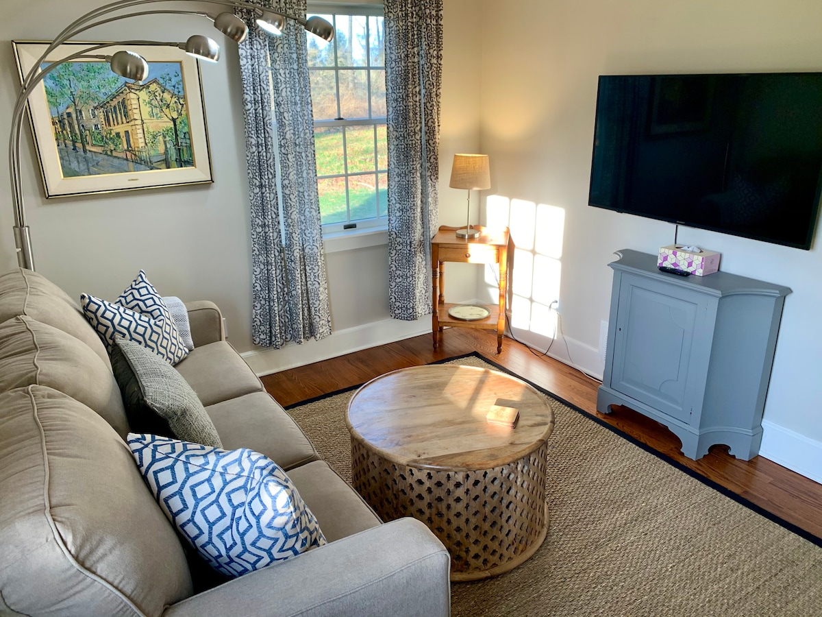 Casa de hóspedes totalmente mobiliada e limpa de 3 QRT 2 BANHEIROS em fazenda de 5 acres em Morristown. Um retiro sereno, bonito e tranquilo que fica perto de Morristown, Nova Iorque, Aeroporto de Newark e Summit. Entrada privativa e estacionamento. Cozinha completa com geladeira, forno a gás/fogão, lava-louças, micro-ondas, cafeteira e torradeira. Sala de estar com TV e sofá-cama queen size. Mesa de jantar. 2 outros quartos separados: 1 cama king size e 1 quarto com 2 camas de solteiro. Lençóis, toalhas incluídas. Academia privada, escritório e lavanderia no porão.