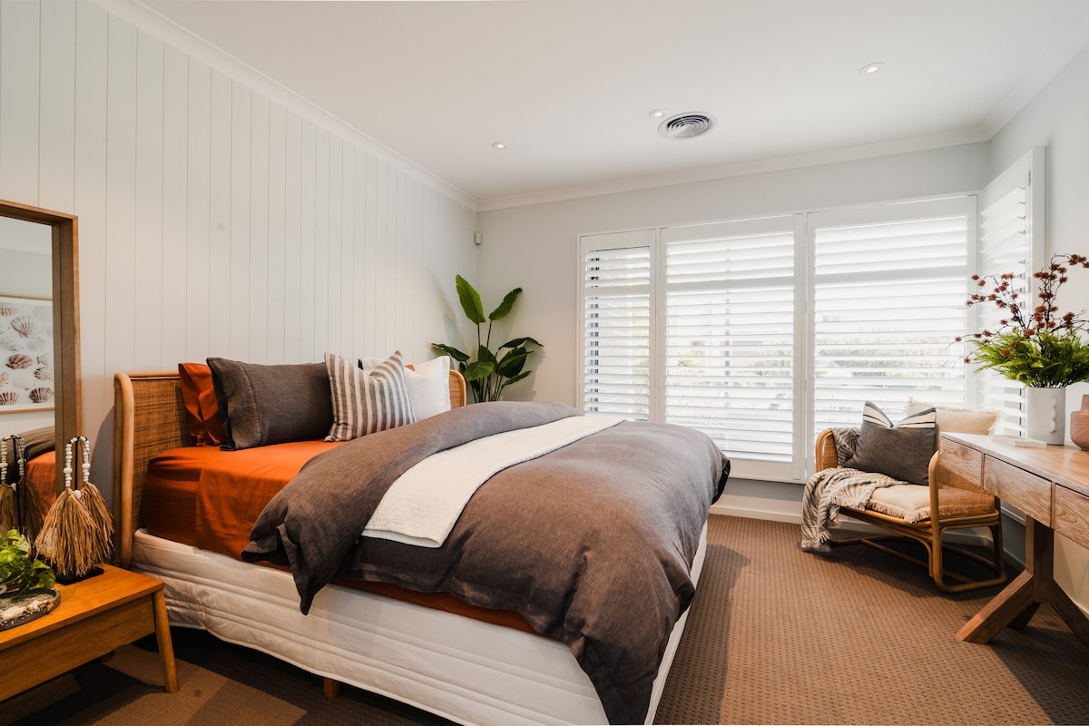 🏡 Relaxe no nosso retiro elegante e espaçoso, perfeito para uma escapada na praia, viagem a trabalho ou refúgio relaxante. Desfrute de uma cama king-size com roupa de cama de qualidade, banheiro de luxo com toucador duplo, cozinha bem equipada e área de estar acolhedora.🏡 ☕ Nespresso e itens básicos de café da manhã Recanto de💻 estudo para trabalho remoto Pátio 🌿 privado Entrada 🚪 privativa e sem espaços compartilhados 🧼 Sem regras de limpeza de check-out surpresa - apenas relaxe e aproveite sua estadia! 💰 Mais espaço do que uma estadia em hotel ⭐ Reserve agora para ter conforto, privacidade e conveniência! ⭐