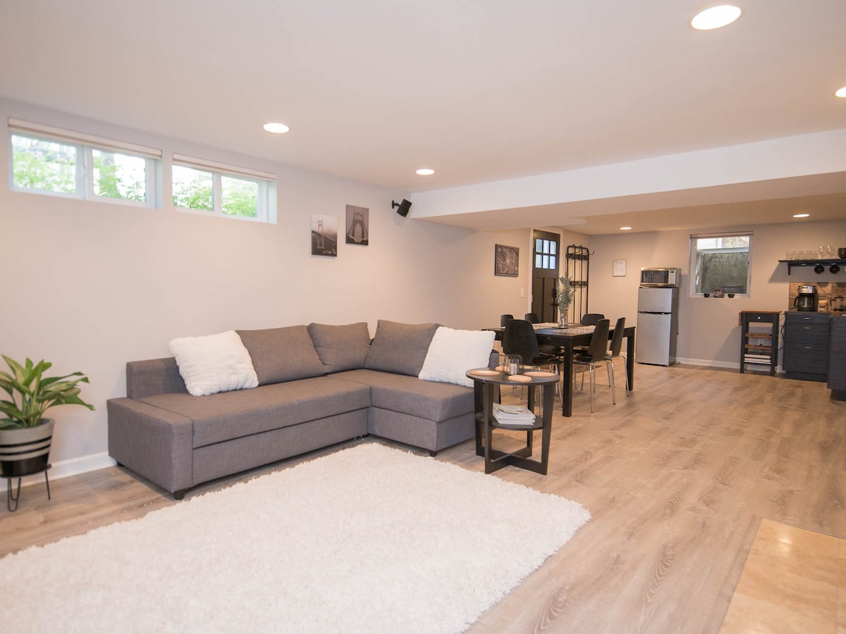 Uma entrada privada leva-o (na cave) a este espaço confortável e tranquilo com uma área de estar com uma TV de 50" com Netflix, mini frigorífico/congelador, micro-ondas, etc. O quarto tem luzes de leitura e uma cama queen. São fornecidos lençóis/toalhas atualizados juntamente com espaço para pendurar as suas roupas. Casa de banho privativa com comodidades, incluindo bidé. A casa está situada a uma curta distância a pé do melhor parque da cidade, restaurantes e lojas! O transporte de massa fica a poucos passos de distância e numa via de bicicleta principal.