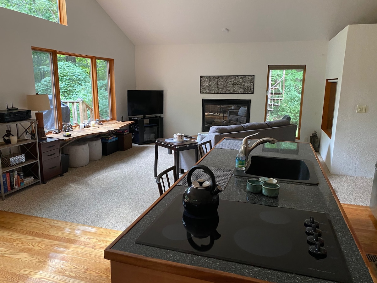 This is an incredible house for groups, spacious, flooded with light, andd spectacular views from almost every room. The main level is a massive open living room/ chef's kitchen/ dining/ fireplace on one level and a sweeping sunny deck. The home features 3 main bedrooms with ensuites, plus 2 other big bedrooms, a total of 5 bathrooms, and a yoga room with views. The perfect, central Catskill location gives you access to restaurants, farm stands, hiking, skiing, Phoenicia, Woodstock, and more!