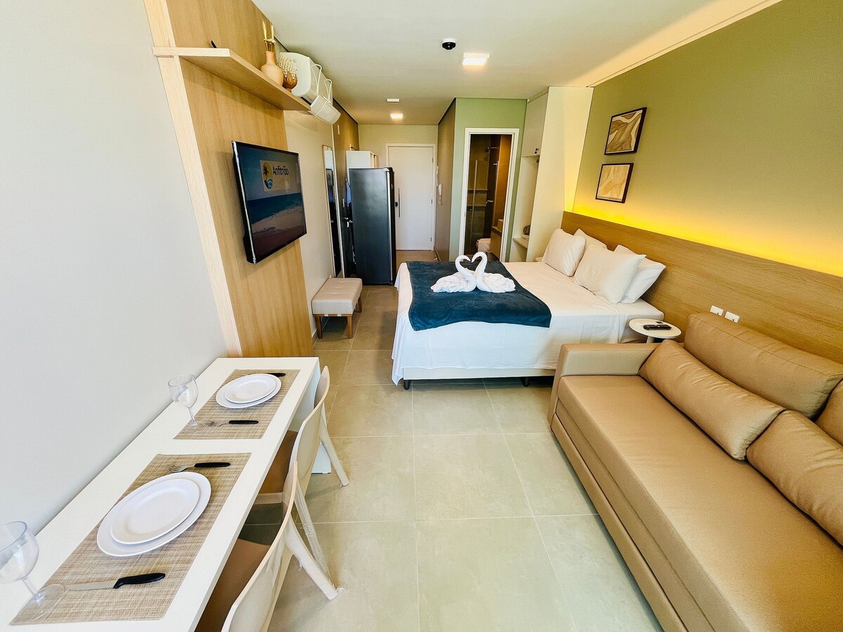 Nosso Lindo e equipado studio com varanda gourmet foi planejado para proporcionar o máximo de conforto aos seus hóspedes. Com 1 cama de casal confortável, 1 colchão auxiliar e 1 excelente sofá cama, acomodamos bem até 4 hóspedes. O Flat possui uma decoração sofisticada que proporciona um ambiente relaxante após um dia de passeios em Porto de Galinhas e Muro Alto. A Cereja do Bolo é nossa varanda gourmet com uma ótima mesa para refeições e vista para o complexo aquático do empreendimento. A cozinha completa é equipada com os principais eletrodomésticos, como geladeira, microondas, cooktop eletrico, cafeteira, liquidificador, sanduicheira e airfryer, além de todos os utensílios necessários para que você possa preparar suas refeições de maneira prática e confortável. O espaço foi projetado para que você tenha tudo o que precisa ao seu alcance, garantindo uma estadia funcional e aconchegante. O apartamento está localizado em um condomínio que oferece uma estrutura completa de lazer com várias piscinas, playground, campo, academia, brinquedoteca, carregamento para carro elétrico, lavanderia, etc.. Temos Ferro de passar e secador de cabelos para maior comodidade dos nossos hóspedes. Se você busca uma acomodação premium, com bastante conforto e espaço, acabou de encontrar o que procurava.