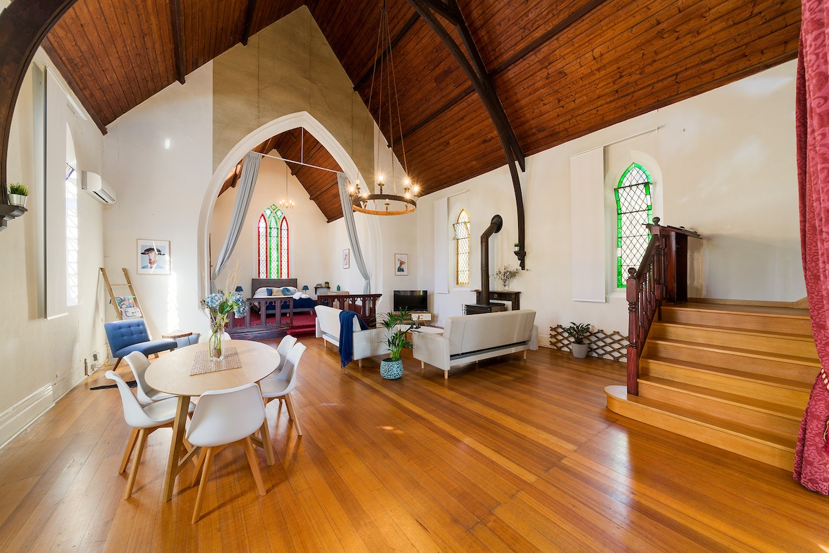 Outrora uma igreja gótica, agora um deslumbrante Bed & Breakfast Retreat, a Villa Nova é incomparável pela singularidade na região de Victoria 's Goldfields. 2 hóspedes e até 6 hóspedes são bem-vindos. Brilhante e espaçoso com sala de estar em plano aberto, 2 quartos, lenha, 2 sistemas de ar condicionado, cozinha totalmente equipada e Wi-Fi fiável. As conveniências modernas de VN, mobiliário contemporâneo e roupa de cama de alta qualidade contrastam lindamente com os tetos altos do edifício gótico de 1870, janelas à luz de chumbo e portas de entrada originais.