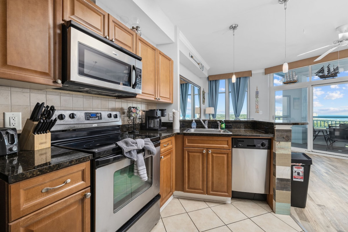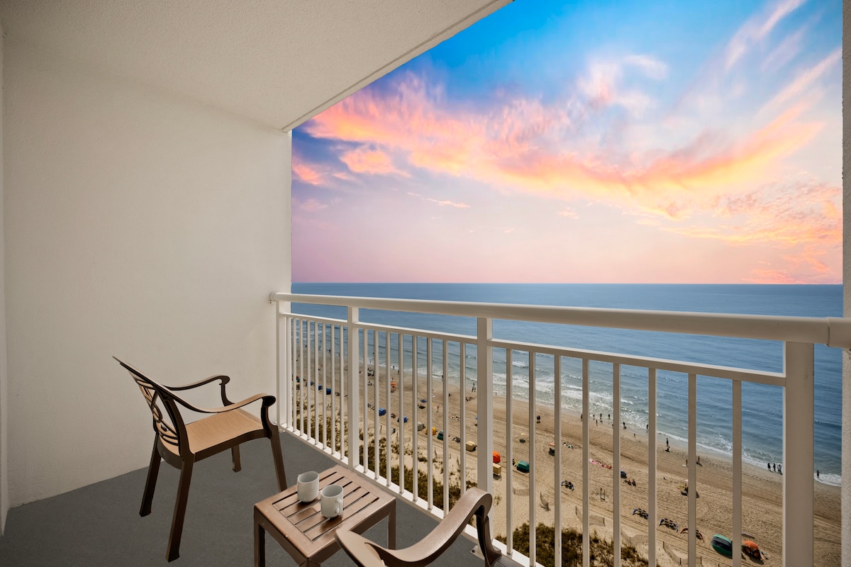 VERDADEIRO 1 cama 1 banheiro 9º andar UNIDADE FINAL vista para o mar nascer do sol condomínio é tudo o que você está procurando! Espaçoso mestre oferece 1 King. Novo sofá-cama e mesa de jantar na área de estar. Chuveiro novo. Máquina de lavar/secar NA UNIDADE! Sala de estar com controle deslizante que se abre para a sua varanda com vista para o mar. Cozinha completa com eletrodomésticos novos. Garagem de estacionamento fechada anexa. NOVO HVAC para conforto! Convenientemente localizado perto de Springmaid Pier, State Park, Market Common, Aeroporto. Piscinas interiores/exteriores, rio lento, banheira de hidromassagem, academia, deck à beira-mar.