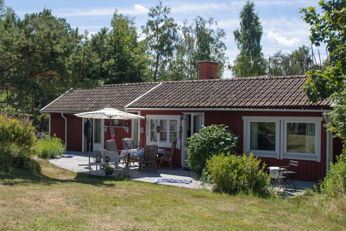 Esta casa fica bem na beira da água. 63 metros quadrados. Muito calmo, perfeito para um fim de semana romântico. Acenda uma lareira, tome banho na banheira de hidromassagem ao lado da casa, ouça as ondas e beba um copo de vinho. Jantar ao pôr do sol. Mergulhe no Mar Báltico a partir do cais após a banheira de hidromassagem. Assista as balsas e iates passarem. Perto de slalompist em Estocolmo. 20 minutos para a cidade de Estocolmo com carro, ou pegar um ônibus ou uma balsa. Ou faça um passeio no arquipélago. 1 caiaque duplo e 2 caiaques individuais estão inclusos.