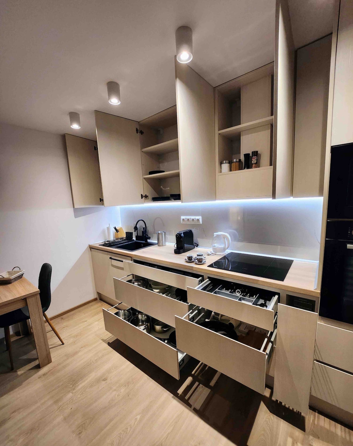 Apartamentos Sparrow - Familiar Superior Apartamento familiar, um monte de amigos, viagens de negócios dos funcionários - a cama de casal embutida pode ser dividida numa cama de solteiro. O belo apartamento novo tem 2 quartos (2 camas de casal 180x200 ou, após dividir, 4 camas de solteiro 90x200 cm), WC separado, casa de banho com banheira e chuveiro, sala com sofá-cama + cama extra, ligada à cozinha e espaçosa área de jantar e entrada para a loggia. O apartamento está localizado no bloco de apartamentos em fios