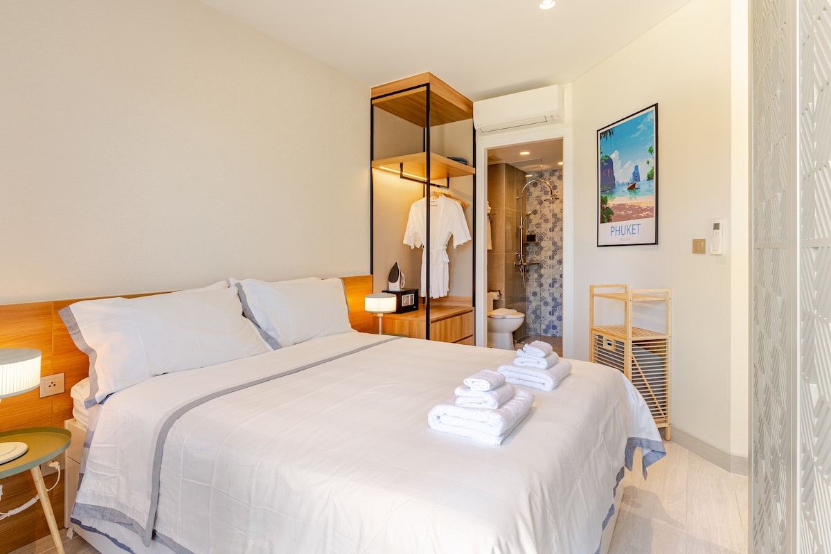 Apartamento 🏝️elegante de 2 quartos num complexo moderno a apenas 300 m da praia de Nai Yang. Desfrute de conforto com têxteis premium, smart TV, cozinha completa e varanda com vista para a vegetação exuberante para relaxar ao ar livre. ✨ Perfeito para famílias com crianças, escapadelas românticas ou trabalho remoto. Apenas 10 minutos a pé da praia!