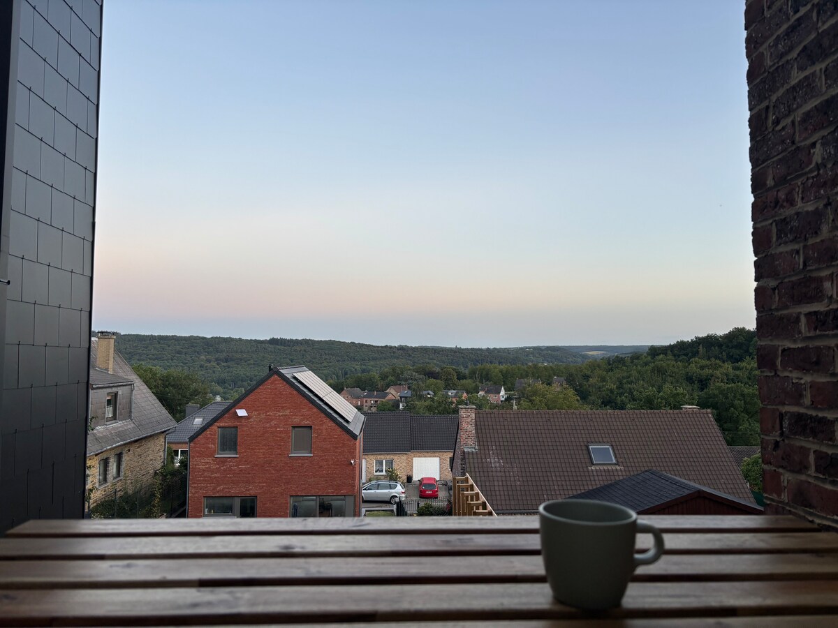 Venha relaxar neste alojamento confortável, localizado numa zona tranquila de Flawinne, a 5 km do centro de Namur. Perfeito para uma estadia a dois, com a família ou amigos, tem um quarto acolhedor, uma sala de estar com um sofá-cama, uma cozinha equipada, uma varanda com vista e estacionamento gratuito. Nas proximidades: pizzaria (5 minutos a pé), supermercados (6 minutos de carro). - Carregador de veículos elétricos - Café Nespresso gratuito. - Cama de guarda-chuva mediante pedido - Sala de bicicletas